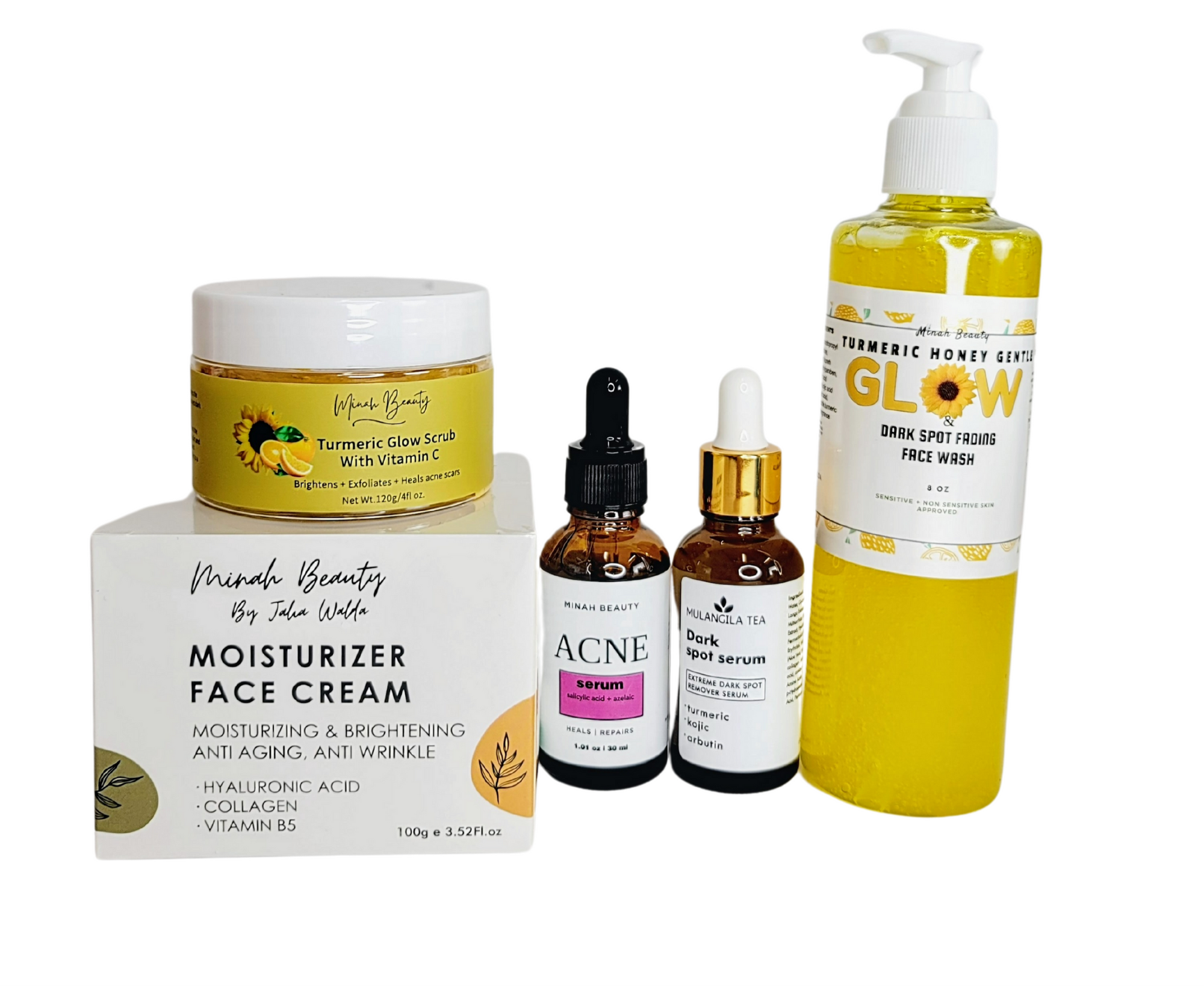 The Minah Acne & Dark Spot Set is your all-in-one solution for clear, radiant skin. This 5-step skincare routine is designed to combat acne, fade dark spots, and promote a healthy, glowing complexion.